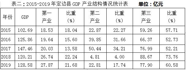 从定边县产业结构来看,2015-2019年第一产业占GDP比重呈现小范围的波动;第二产业占GDP比重总体呈现下降趋势,从2015年的22.27%下降到2019年的17.74%,2018年最低,仅为4%;第三产业占GDP比重总体呈现上升的趋势,在三次产业中占GDP比重最高,从2015年的57.71%上升到2019年的60.58%,2018年最高,为73.76%(如表二)。