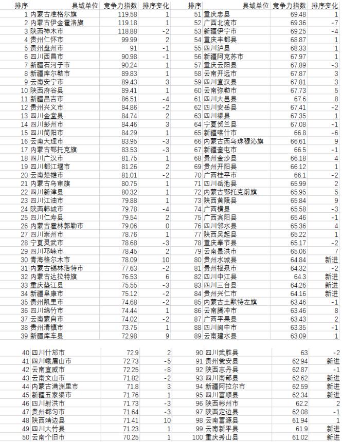 报告显示,2019中国西部百强县市在10个省区市有分布,分别为四川29个、云南14个、贵州12个、内蒙古11个、新疆11个、陕西9个、重庆6个、广西5个、宁夏2个、青海1个。甘肃、西藏没有县市入围。内蒙古准格尔旗、伊金霍洛旗,陕西神木市,贵州仁怀市、盘州市,四川西昌市,新疆石河子市、库尔勒市,云南安宁市,陕西府谷县位居前10位。其中,云南安宁市和陕西府谷县系首次进入西部十强。贵州水城县、兴仁市、瓮安县,四川中江县、三台县、富顺县、南部县,新疆阿拉尔市,云南新平县,重庆秀山县等10个县市为首次进入西部百强县市名单。