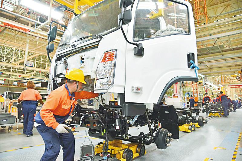 在吉利南充基地,工人正在工厂流水线上组装货车。