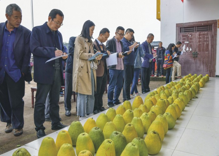 当天上午9时许,龙安乡、大龙乡等乡镇的36户柚农将采摘的新鲜柚果送到评选现场。区农业农村局工作人员将柚果分成三组,逐一编号后整齐地摆放在地面。随后,10名评委对照标准,仔细观察每枚柚果的外观,从果形、色泽、光滑度三个方面逐项进行打分。接着,工作人员切开柚果,剥开果瓣,评委详细查看柚果的内质,分别从肉色、果肉成形度、种子等方面进行打分。评委还带来了专门的测量仪器,对柚果的含糖量及酸性成分等可溶性固形物进行科学测量,让参评的柚农感受到评比的公开公平公正。