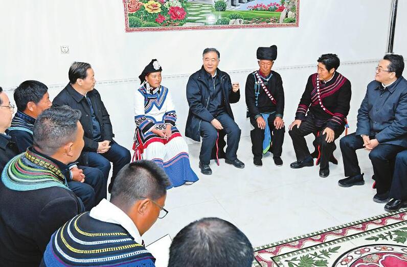 12月12日至14日,中共中央政治局常委、全国政协主席汪洋在四川凉山彝族自治州调研脱贫攻坚工作。这是12月13日,汪洋在昭觉县解放乡火普村同彝族群众座谈。记者 饶爱民摄