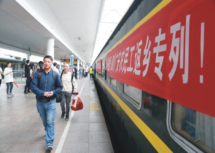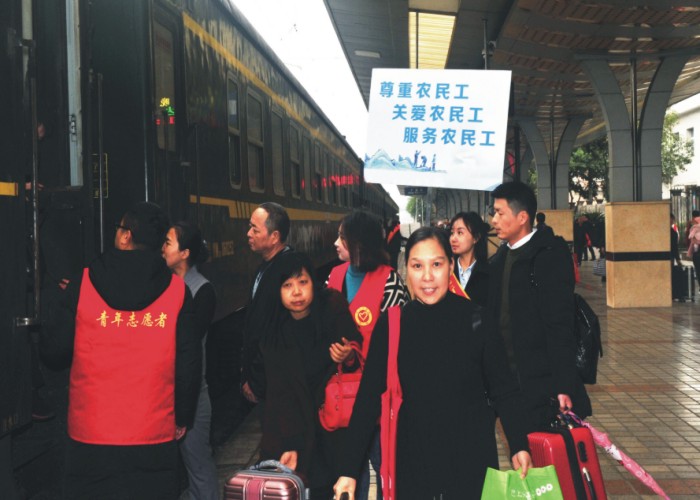 当农民工走下火车时,早已等候在站台的80多名青年志愿者们迅速行动起来,他们快速走上去帮助返乡农民工搬运行李。