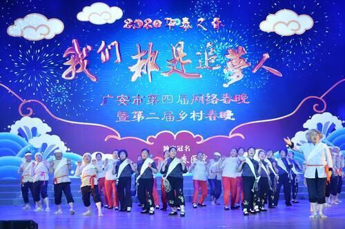 晚上7时30分,一群身着喜庆服装的小朋友登了舞台,在欢庆的歌舞《福到千万家》中,广安市第四届网络春晚暨第二届乡村春晚拉开了序幕。在随后的节目中,《渠江号子》通过一群老船工登台表演,再现了渠江流域船工们在拉纤时辛勤劳作的场景,反映了渠江流域劳动人民齐心协力、团结拼博的精神;而小品《回家过年》则讲述了边防战士因为保家卫国,不能回家与患有老年痴呆症的父亲过年团圆的感人故事……随着一个个精彩纷呈的节目登场,现场掌声不断。