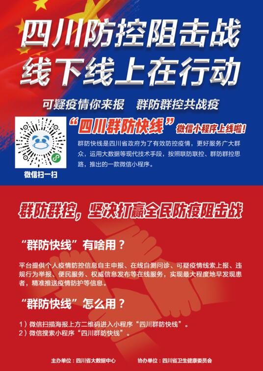 为扎实做好新型冠状病毒感染的肺炎疫情防控工作,整合线上线下力量,实现联防联控和群防群治,近日四川率先在全国推出直接为公众提供防控服务的省级专用平台——“四川群防快线”。