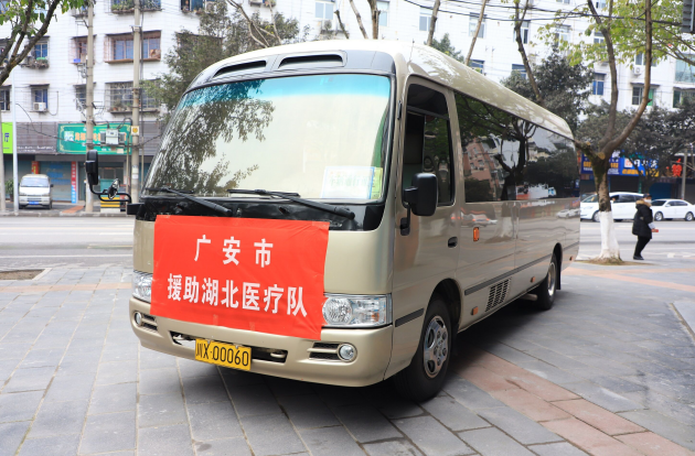 2月13日上午10时许,在广安市疾控中心旁,广安市首支援鄂医疗队的10名医护人员搭乘一辆考斯特,与两辆装载各种应急物资的商务车组成车队,从这里出发赶往成都双流机场,与四川其他医疗队汇合后,统一乘飞机前往湖北支援。