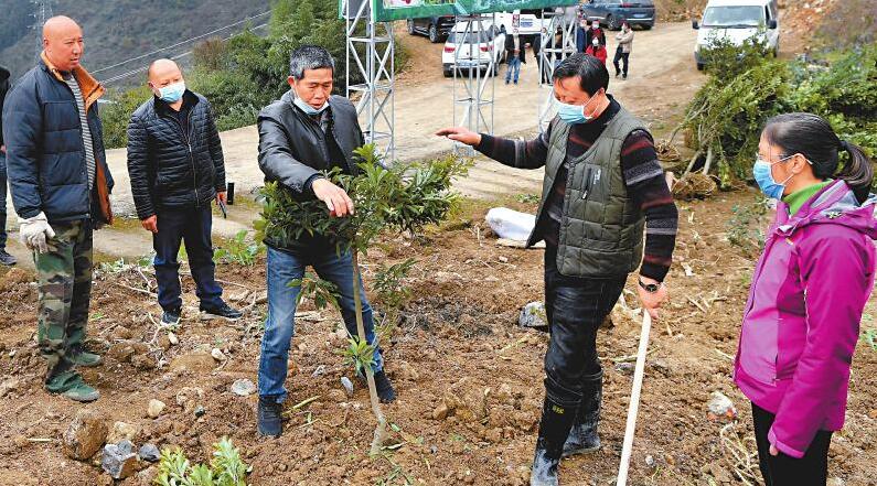 兰溪来的技术人员(中)现场指导村民栽植杨梅苗。记者徐登林摄