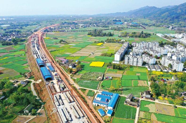 近日,成都经济区环线高速公路建设项目全面复工,建设者们在严格落实疫情防控措施的同时,抢抓工期赶进度,全力推进重点工程建设。图为3月19日,成都经济区环线高速公路彭州市境内的施工现场。罗国杨摄(视觉四川)