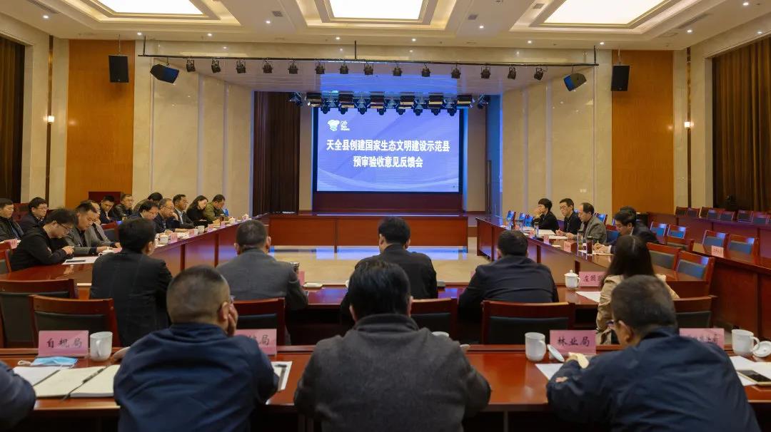 预审工作反馈会上,预审组通报了预审核查意见,预审组认为:天全县达到了国家生态文明建设示范县的申报条件,满足示范县创建要求,同意按程序上报第四批国家生态文明建设示范县。