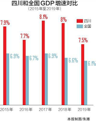 “1、1、1.2、1.4、1.4”。上述5个数字,分别是2015年至2019年,四川年度GDP增速高于全国GDP增速的百分点数值。由此可见,过去5年,四川GDP增速一直高于全国1个百分点以上。