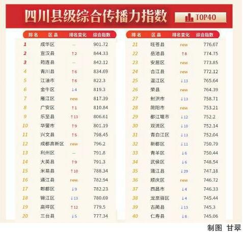 从综合传播力指数看,资阳市雁江区新入围即达第七名。影响力指数排名中,成都市郫都区上升幅度最大;公开度指数排名中,有一半是新入围县(市、区),其中宜宾市翠屏区排名最高(第六名);赞同度指数排名中,成都市彭州市排名上升最多。