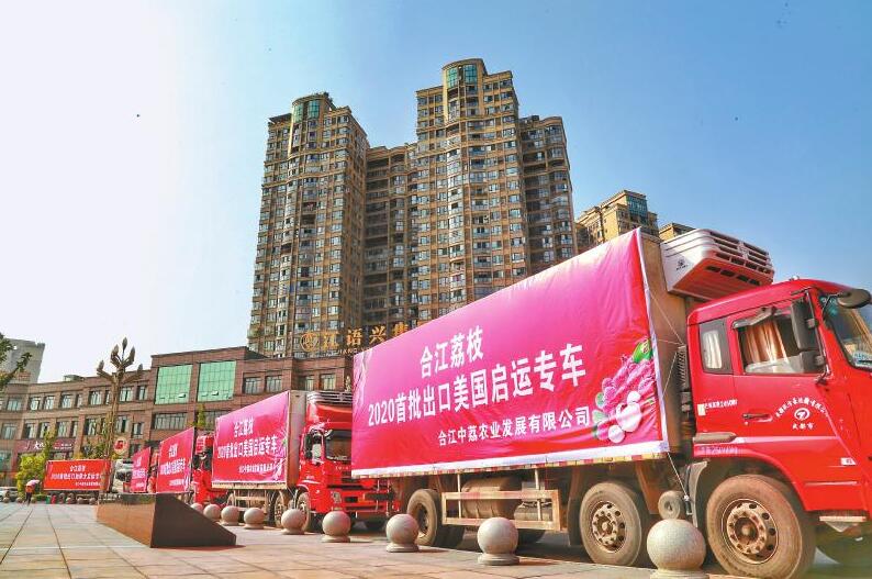 7月23日上午,泸州市合江县贵妃大道,5台满载40吨、价值12万美元荔枝的卡车启运前往深圳,将越洋跨海,进入美国和加拿大商超。这是四川荔枝真正意义上的首次出口,也是首次进军北美市场。