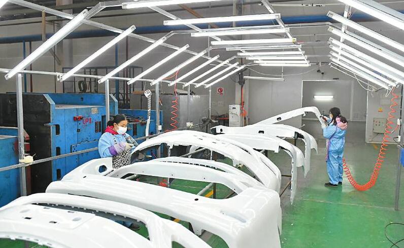 绵阳秦川恒远汽车电器有限公司内外饰车间里,工人正在生产汽车保险杠。蒲滔摄(视觉四川资料图片)