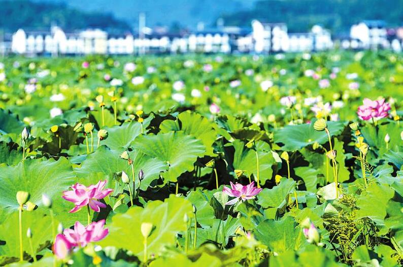 跟随普安镇党委书记程先君的脚步,记者走到了荷塘中的亭子里。“荷塘分为‘月色荷塘’‘佛韵莲香’两大区域,面积达万亩以上。”程先君介绍,其中,“月色荷塘区”配套建成望荷亭、“一步一景”休闲观景亭13个和宝塔坝新村文化广场;“佛韵莲香区”打造了“佛韵莲香”旅游广场、荷塘乐园体验区等旅游设施。