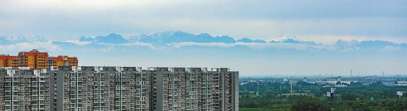 8月18日傍晚,在成都市青白江区可以看见远处龙门山脉连绵起伏的雪山。白桂斌摄(视觉四川)