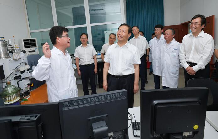 看望正在工作的侯明才(左一)教授,听取实验室建设、科研成果及人才培养等情况介绍。