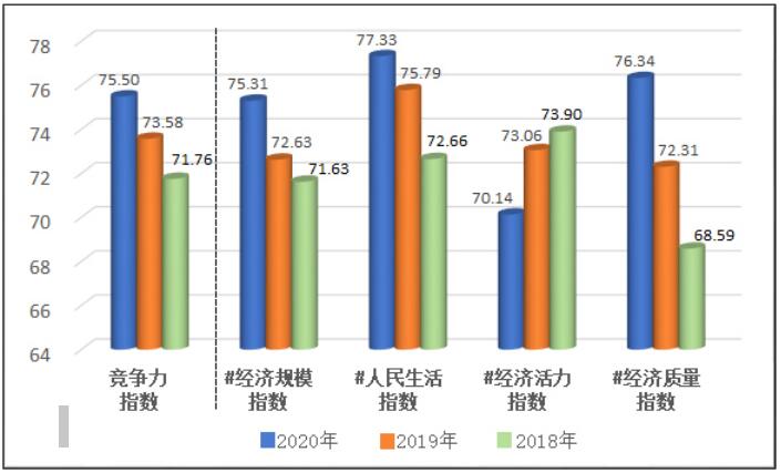 《报告》指出,2020中国西部百强县市竞争力指数平均值达到75.50,比去年提高1.92。在分项指数中,经济规模指数、人民生活指数、经济活力指数、经济质量指数平均值分别为75.31、77.33、70.14、76.34,分别比去年提高2.68、1.54、-2.92、4.03,上升幅度分别比上年度扩大1.68、-1.59、-2.08、0.31。数据显示,西部百强县综合指数持续提高,但分项指数表现差异较大。经济质量指数、经济规模指数加速上升,人民生活指数稳步提升但增速放缓,经济活力指数下降,“提质降速”趋势明显。监测结果表明,西部地区县域综合竞争力持续增强,具体表现在经济高质量发展取得初步成果、保障和改善民生水平持续提高、经济规模快速壮大(含第四次全国经济普查后数据口径调整等因素叠加影响),同时也表明,西部县域发展动力有明显下滑趋势。