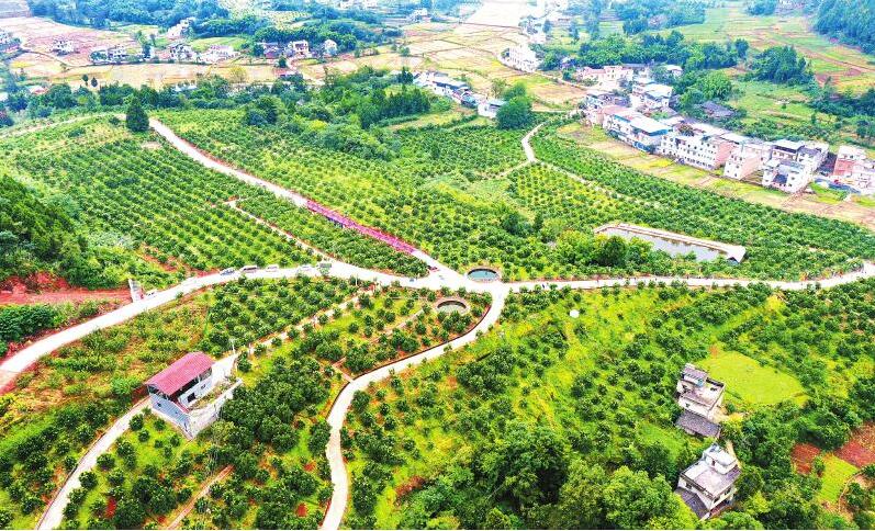 近年来,中江县共发展中江柚3.5万亩,其中在永安镇母本园种植中江柚1.1万亩,年均产量3000余吨,产值6000余万元;园区年吸纳贫困户务工653人,人均年增收2000余元。图为10月10日鸟瞰永安镇中江柚产业园。肖开丰摄