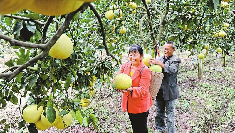 10月10日,中江县永安镇永安村贫困户在产业园采摘柚子。肖开丰摄