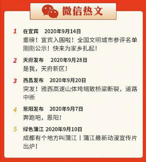 本期指数共纳入统计微信账号8110个、微信文章26.2万余篇,其中阅读量达“10万+”的文章共6篇,题材主要为地方城市宣传。同时,本期指数共纳入统计微博账号11442个,月累计点赞量前五名账号依次为“成都青白江”“成华发布”“叙永法院”“给力都江堰”“双流网”。