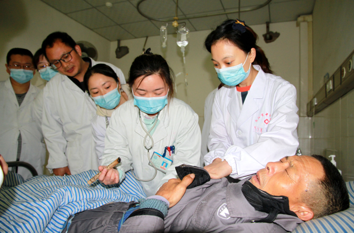 4月19日,在内江市东兴区白合中心卫生院,区科协、老科协派遣的科技特派员在病房现场指导中医适宜技术推广应用。