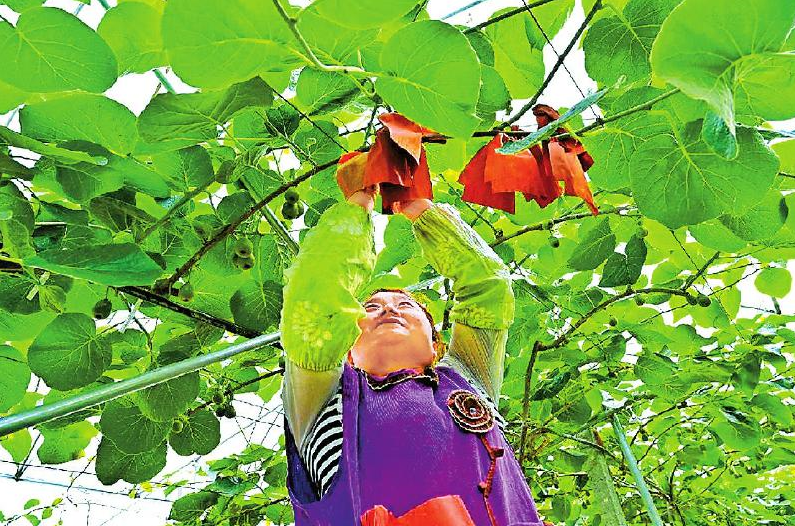 村民在为猕猴桃套袋,100天后就是猕猴桃成熟期。记者 华小峰 摄