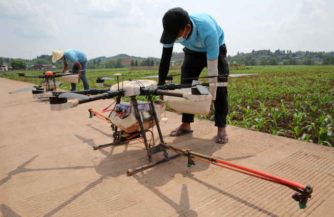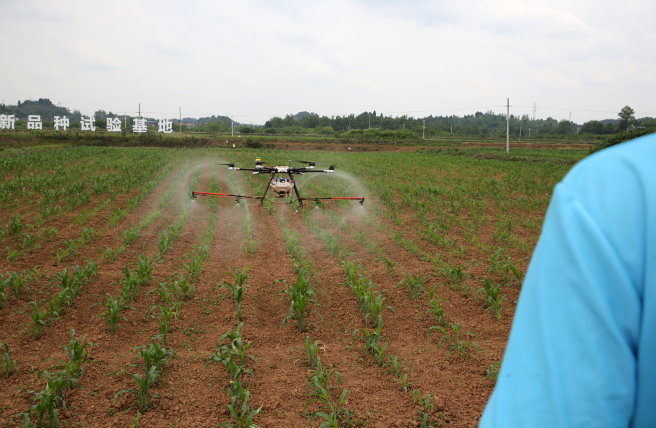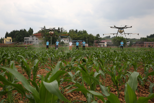 2021年5月19日,在四川省内江市东兴区田家镇火花村,农技人员操作植保无人机对玉米进行病虫害防治。