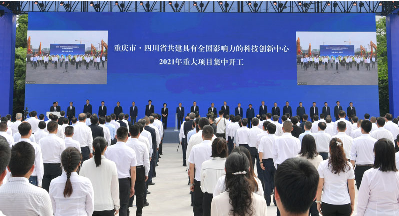 会议结束后,重庆市·四川省共建具有全国影响力的科技创新中心2021年重大项目举行集中开工。陈敏尔、彭清华、唐良智、黄强等出席,通过视频连线方式,听取重庆两江新区、西部(成都)科学城、西部(重庆)科学城、中国(绵阳)科技城负责同志汇报开工项目准备情况。在热烈掌声中,陈敏尔、彭清华、唐良智、黄强共同启动开工装置,标志着总投资超过1000亿元的40个重大项目正式建设。