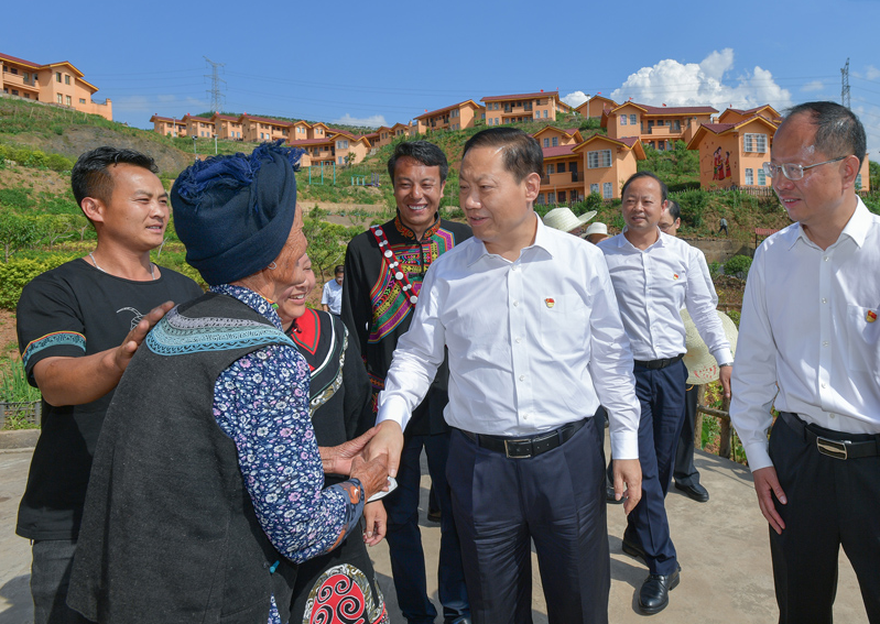 5月31日,省委书记彭清华到峨边县新林镇茗新村调研,察看村容村貌,看望已脱贫群众。