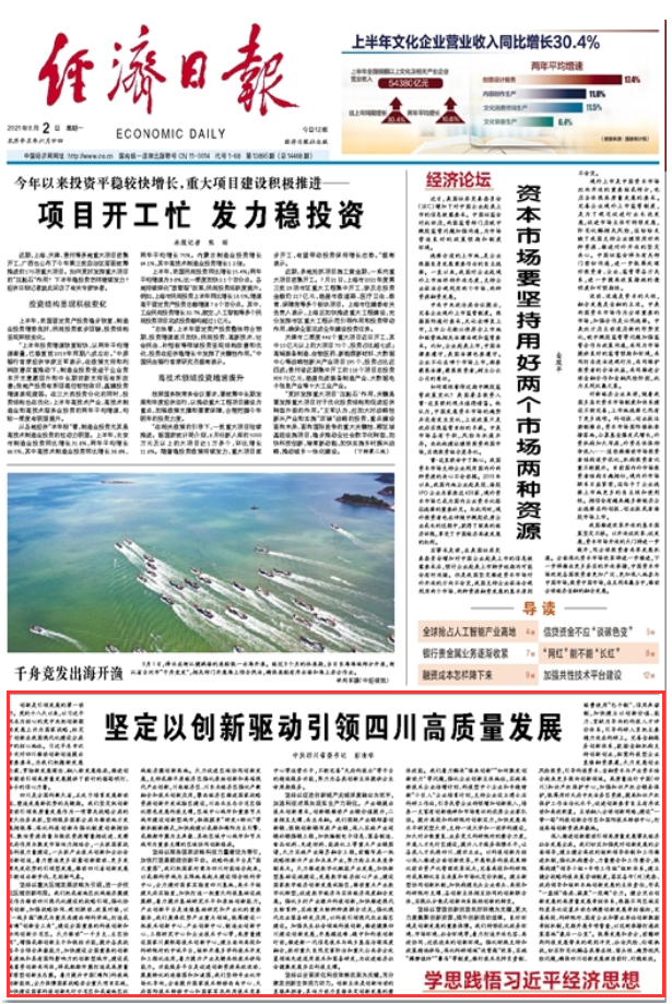 《经济日报》8月2日在“学思践悟习近平经济思想”专栏中,发表了中共四川省委书记彭清华的署名文章《坚定以创新驱动引领四川高质量发展》,予以转载。