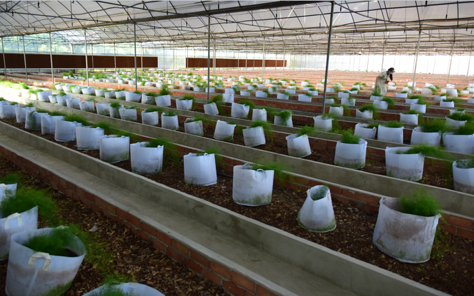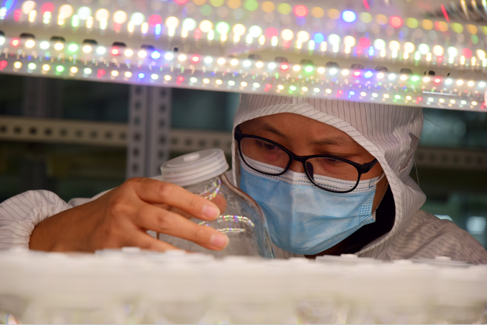 技术人员正在查看不同光照条件下天冬组培苗的生长情况