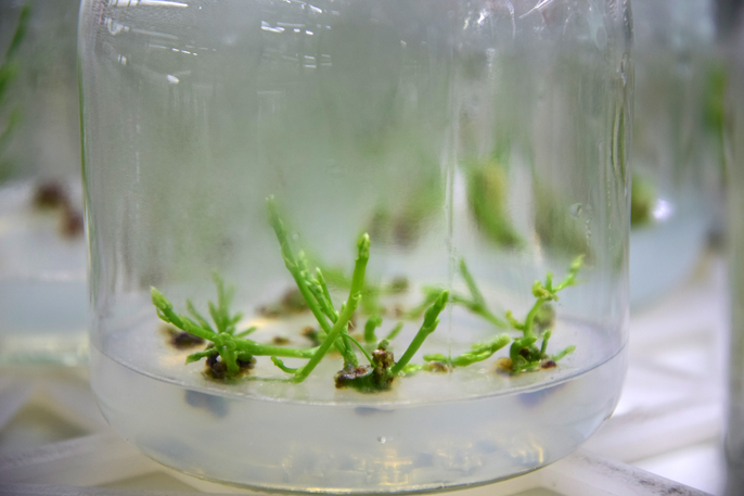 四川天草润东生物科技有限公司组培室中拍摄的已培养29天的天冬增殖苗
