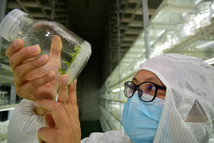 技术人员正在查看天冬组培苗生长情况