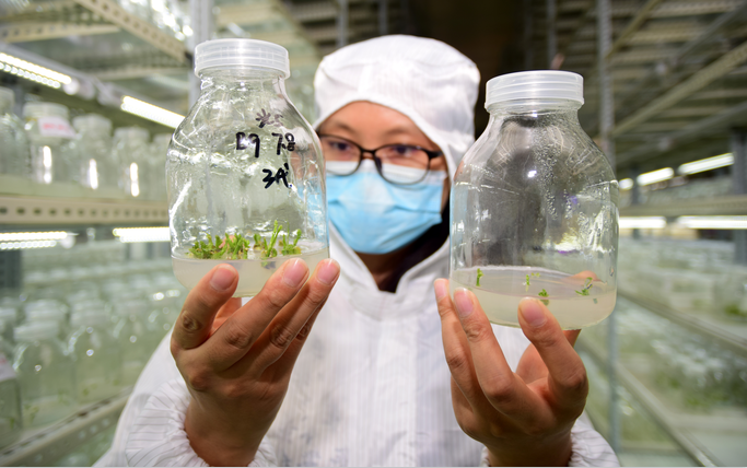 技术人员正在对比天冬组培苗生长情况
