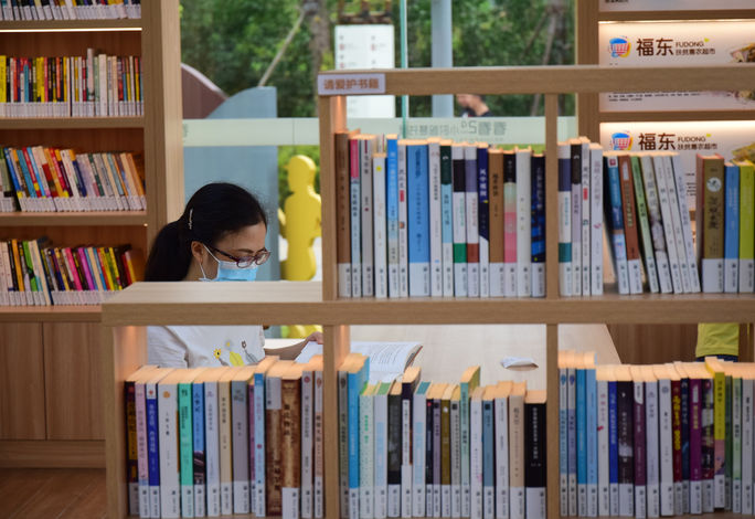 2021年8月8日,内江市东兴区小青龙河湿地公园,小朋友在“看看24小时智慧书屋”内阅读书籍