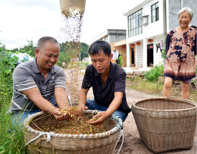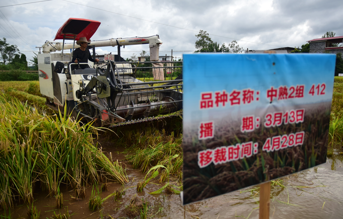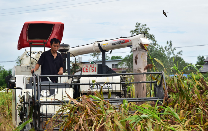 2021年8月14日,在内江市东兴区石子镇太和村,东兴区宏展粮油专业合作社的农机驾驶员正利用晴好天气,抢收水稻、高粱。