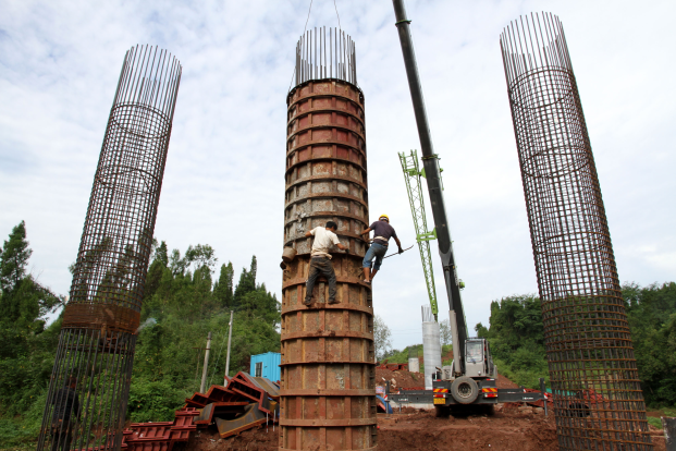 筑路工人加紧为黄连坪大桥架设墩柱