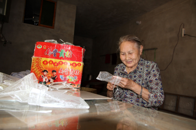 八旬老人在家里为社区“微工厂”赶制纱袋订单