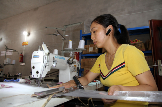 在社区“微工厂”检查缝纫线连接情况