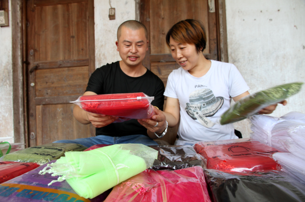 9月14日,在内江市东兴区永兴镇永兴社区,当地留守妇女在家里为社区“微工厂”赶制纱袋订单。