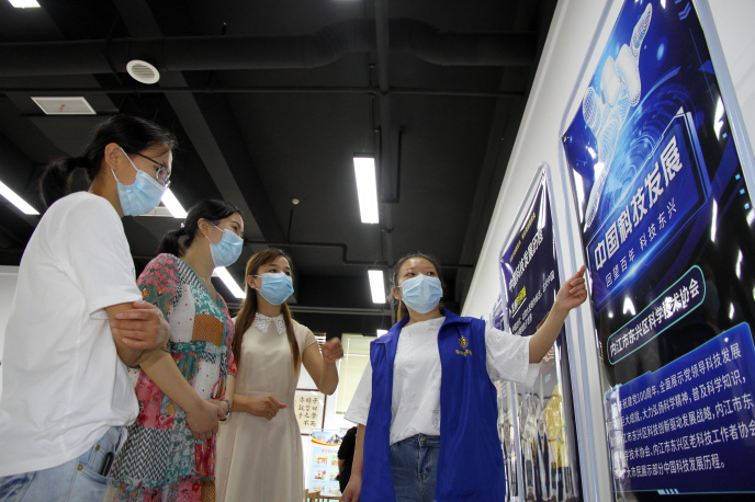 向参观人群介绍我国和当地科技发展情况