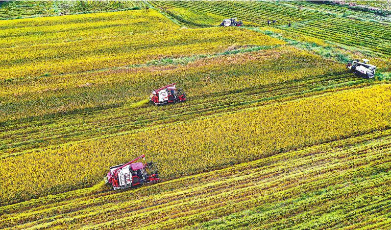 10月15日,成都市青白江区弥牟镇狮子村的水稻种植区里稻谷飘香、机器轰鸣,秋粮喜获丰收。白桂斌 摄(视觉四川)