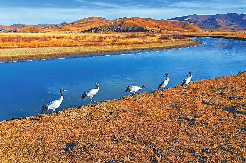11月8日,国家一级保护动物黑颈鹤在黄河重要水源涵养地和生态功能保护区曼扎塘湿地漫步。每年3月底,黑颈鹤跨越近1000公里,飞至阿坝州阿坝县曼扎塘湿地繁育幼崽。每年初冬,黑颈鹤会南迁至云南等地越冬。 (用旦 摄 视觉四川)