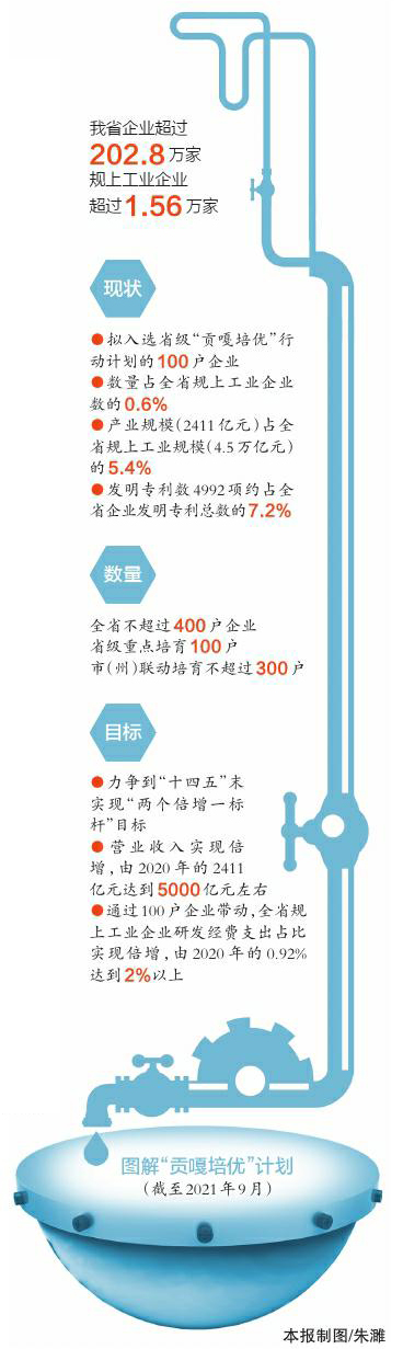 按照行动计划,100户成长性“优质企业”,将力争到“十四五”末实现“两个倍增一标杆”目标,即营业收入实现倍增,由2020年的2411亿元达到5000亿元左右;通过100户企业带动,全省规上工业企业研发经费支出占比实现倍增,由2020年的0.92%达到2%以上;同时成为全省企业低碳高质量发展的标杆。