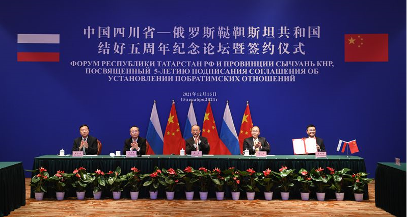 12月15日,中国四川省—俄罗斯鞑靼斯坦共和国结好五周年纪念论坛暨签约仪式通过视频连线方式举行。省委副书记、省长黄强,俄罗斯鞑靼斯坦共和国总统明尼哈诺夫作线上致辞并见证签约。