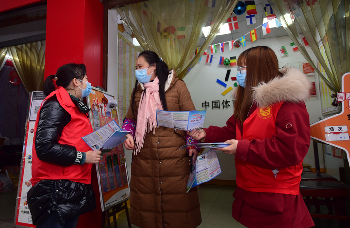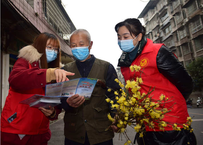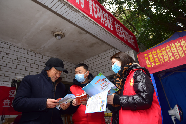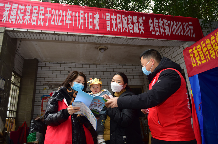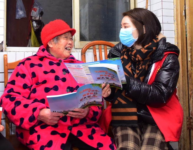 2022年1月13日,在内江市东兴区西林街道月亮社区,东兴区委宣传部的党员志愿者正为居民讲解非法集资的危害。