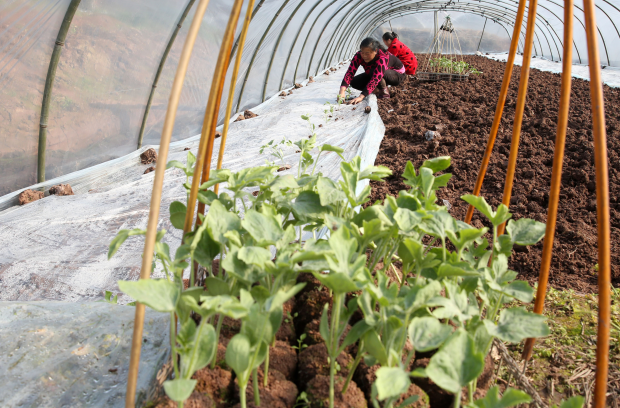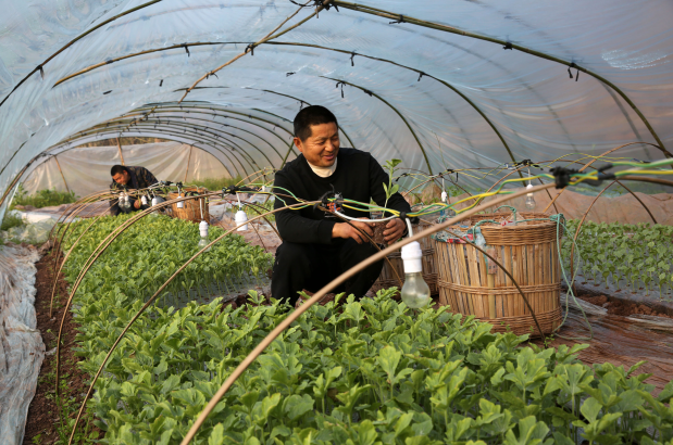 2022年2月11日,村民在四川省内江市东兴区椑木镇高崇村的郭北西瓜种植专业合作社种植基地移栽西瓜幼苗。