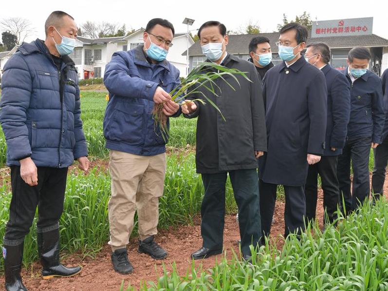 一年之计在于春,巴蜀大地一派春耕生产的忙碌景象。调研中,彭清华每到一地都听取市县春耕备耕工作情况汇报,对青神县将5000亩草坪退还为良田、威远县在果园推广粮经复合种植等做法给予肯定。在仁寿县珠嘉镇棚村村,彭清华实地察看小麦等粮食作物长势,与正在田间耕作管护的农技人员和村民亲切交流,询问培育本地种质资源、实施“麦玉豆”三熟轮作种植技术等情况。他指出,抓好粮食等重要农产品生产供给,是今年“三农”工作的头等大事。要落实“长牙齿”的耕地保护硬措施,持续开展高标准农田建设,鼓励各地加强粮食生产,因地制宜推广新品种新技术,不断提高粮食综合生产能力。要做好种子、化肥、农药、农机具等物资准备,保证春耕生产需要。借助农村两项改革,青神县青竹街道兰沟村盘活用好村闲置资产发展旅游业,村集体经济年收入从1.3万元增长至80.1万元;威远县无花果博览园建成主题鲜明的农旅融合综合体,带农增收作用明显。彭清华指出,推动两项改革“后半篇”走深走实,既要做强产业支撑,又要把握人口变化趋势,科学编制乡村国土空间规划,培育壮大中心镇(村),积极发展新型农村集体经济,优化资源配置、提升公共服务水平,更好满足人民群众对美好生活的新期待。