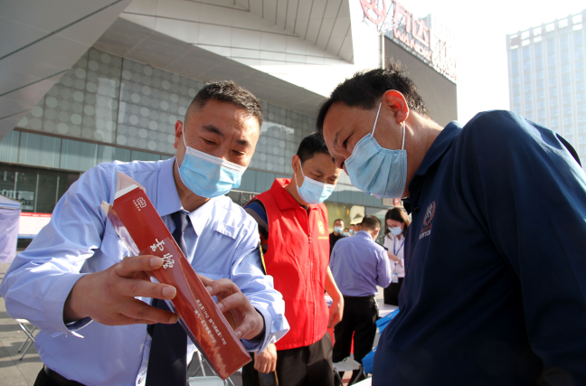 工作人员向过往群众介绍烟草真假识别知识