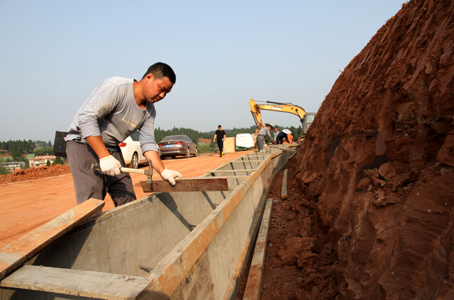 筑路民工正在为园区道路路沿架模