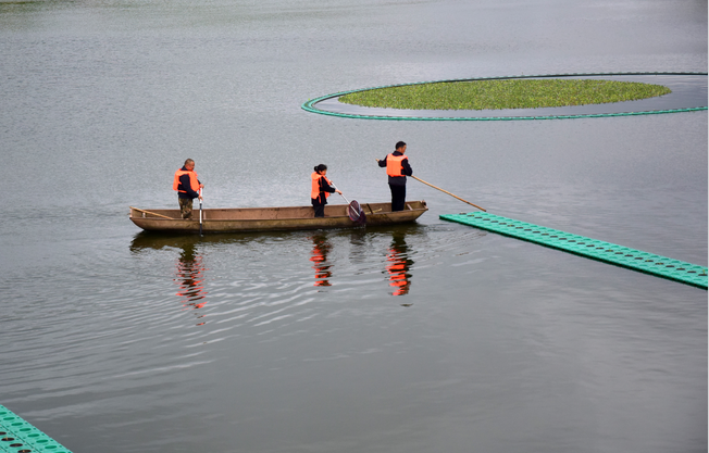 工作人员打捞水面漂浮物